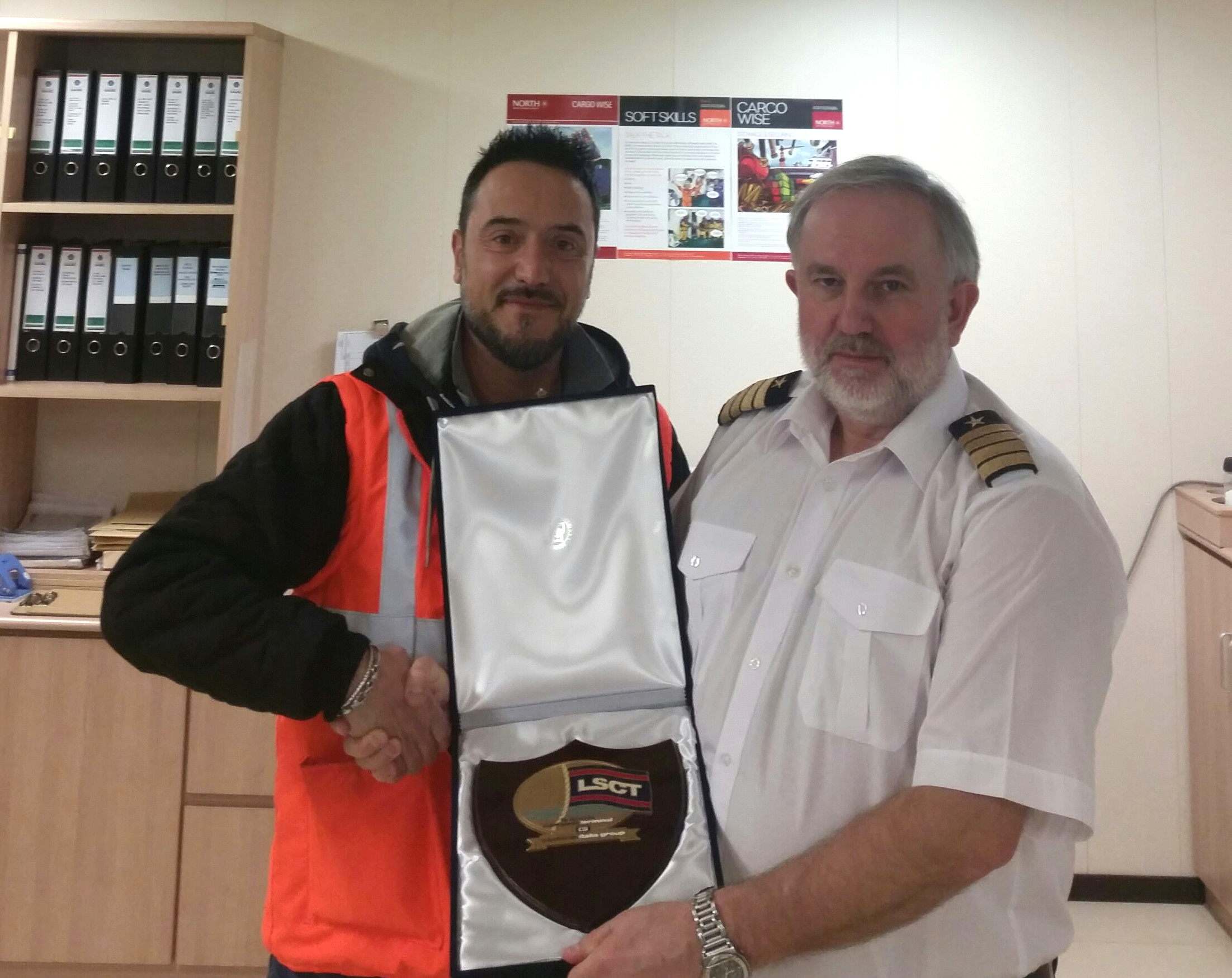 Polish captain Czeslaw Ignacy was presented with the traditional memento by planner Simone Canata, pictured together for the Linah’s maiden call at La Spezia.