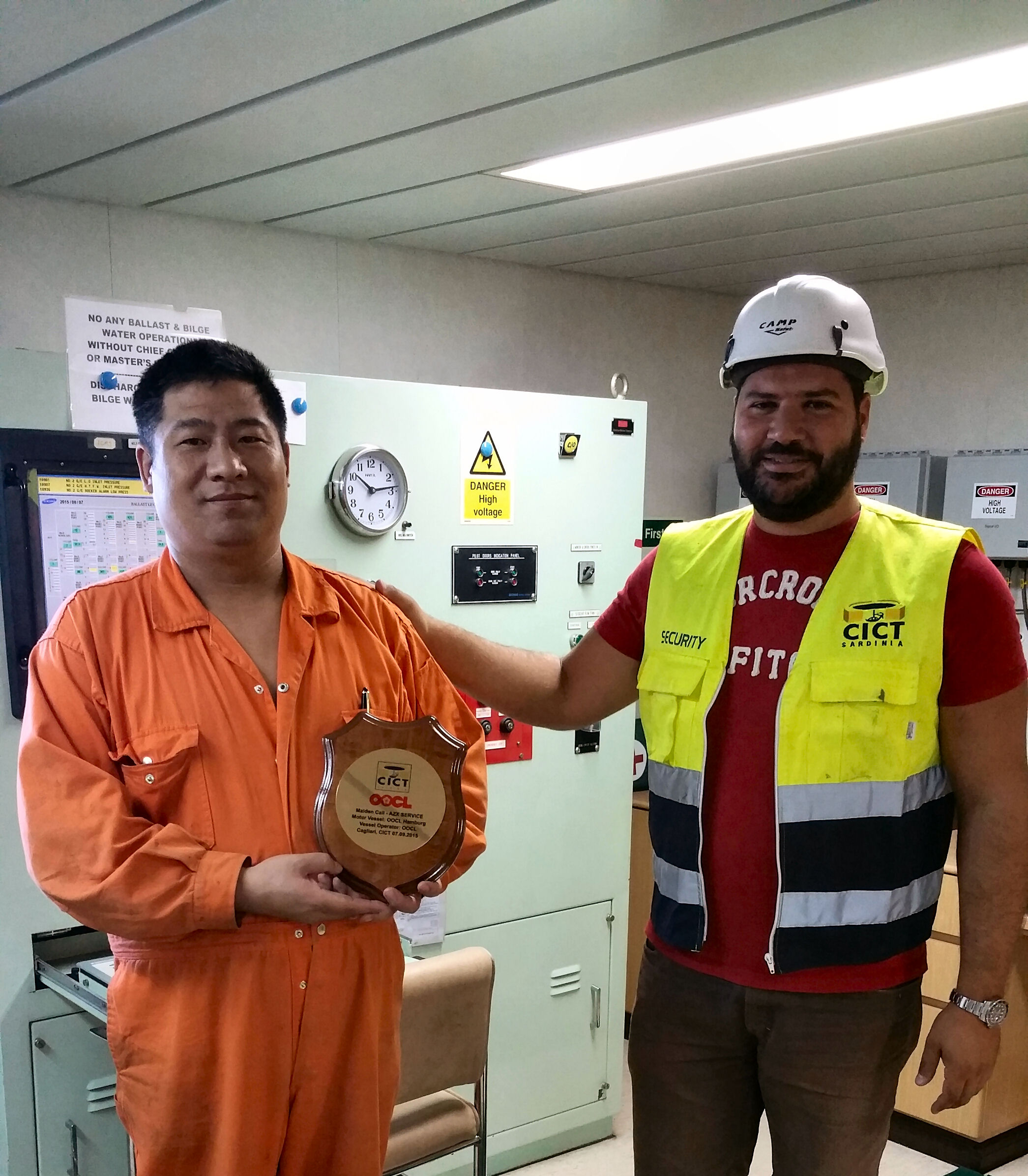 As customary in Cagliari, a ceremony for the maiden call was held on board the ship, with Christian Marras (CICT Ship Planner) presenting a customized crest to Chief Officer Liu Zhidong.