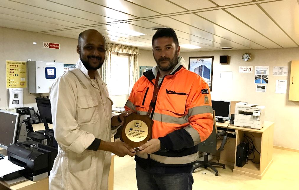 Tradition was respected at CICT as chief officer Varun Marian Pinto was presented with the customized crest by terminal planner Andrea Pontis, a memento of the m/v Tolten’s maiden call. As planned, the ship sailed next day on schedule.