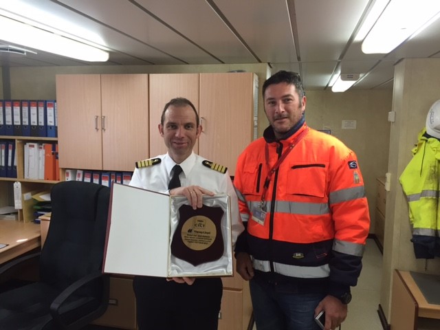 Following the recent phase in/out operation which took place between May 19th and 21st, further news on the Med Gulf Express (MGX) service as Cagliari International Container Terminal (CICT) welcomed the maiden call of the m/v London Express on Tuesday May 26th 2015. Owned and operated by German shipping line Hapag Lloyd AG, this 4,621 TEUs ship is deployed along the Med-US string linking the Mediterranean to ports in the US Gulf and Central America. Berthed upon arrival in Cagliari, m/v London Express completed operations the same day, with the traditional crest being presented to Captain Markus Droste by CICT vessel planner Andrea Pontis.
