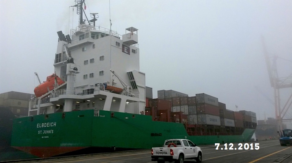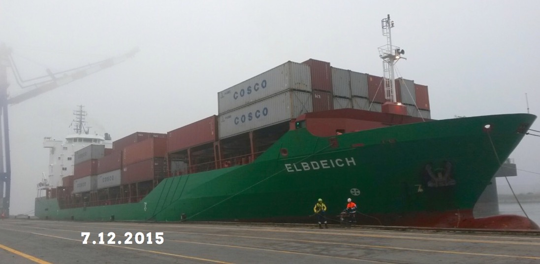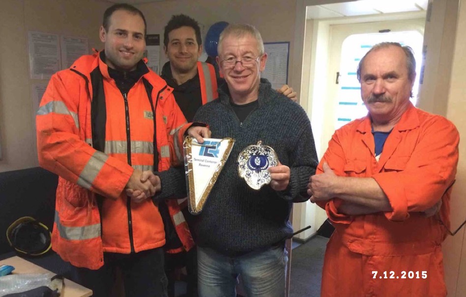 In the group picture, the welcome ceremony on the m/v Elbdeich with TCR planner Roberto Geminiani (first from the left), the Vessel Captain Vladislav Vorodin and the first Officer Mr. Konstantinas Mmaiborada (first from the right) and a representative of Marcandia - Cosco Local Agent, Mr Eugenio Vistoli. In the other pictures: m/v COSCO Beijing and m/v Elbdeich berthed in La Spezia and Ravenna.