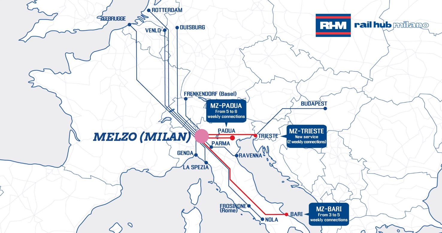 Following the recent introduction of a sixth train, increasing the frequency from Melzo to Padua, the rail network available from Rail Hub Milano (RHM) continues to develop further with the announcement of a new Melzo-Trieste connection as well as two additional weekly trains on the Melzo-Bari route.