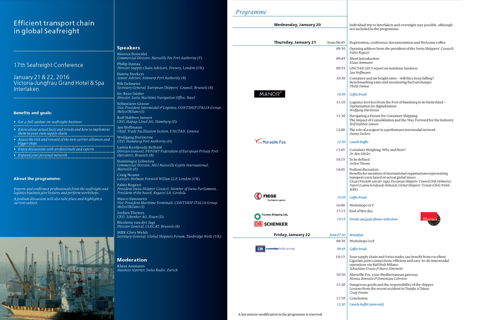 Thursday 21st and Friday 22nd January Contship will take part to the 17th Seafreight Conference, organized by the Swiss Shippers’ Council in Interlaken, where experts and professionals from the seafreight and logistics business will give lectures and perform workshops focusing on the efficiency of the transport chain in global Seafreight.