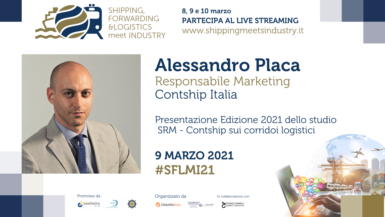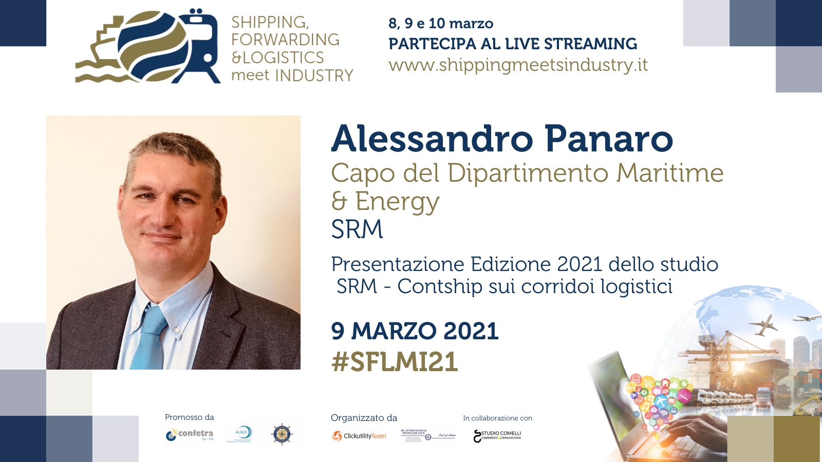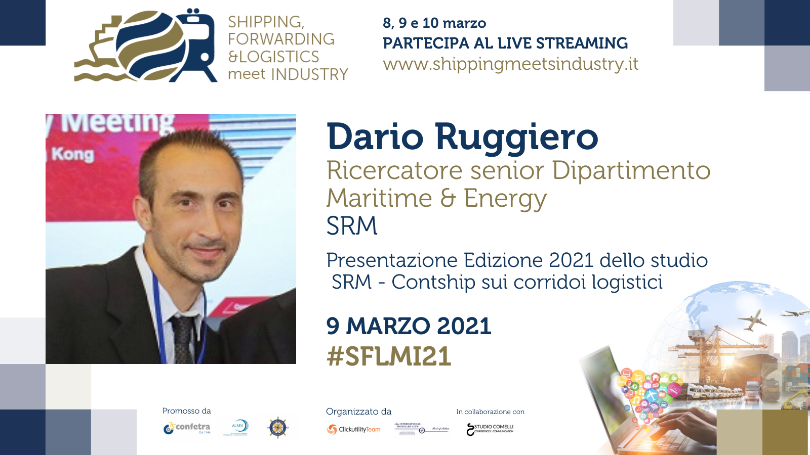 Alessandro Placa (Contship Italia), Alessandro Panaro (SRM), and Dario Ruggiero (SRM) will present the 2021 Report “Corridors and logistic efficiency of the Territories” on Tuesday 9 March at 2.00 pm.