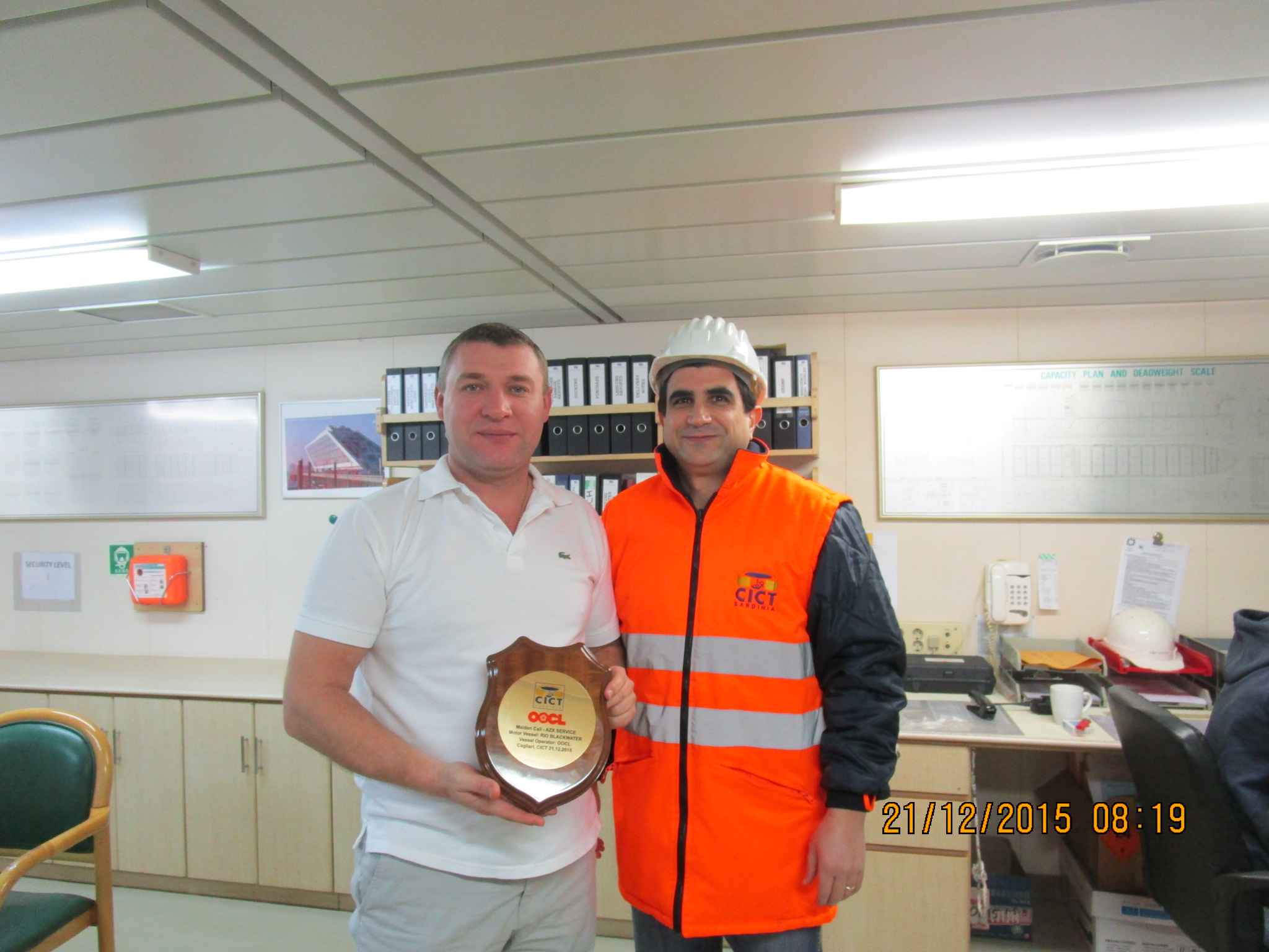 Captains T. Matysiak and M. Kiyanemko, of m/v Chicago Express and m/v Rio Blackwater respectively, were presented with the CICT memento by terminal planners Christian Marras and Maurizio Defrassu, a gift to all members of the crews.