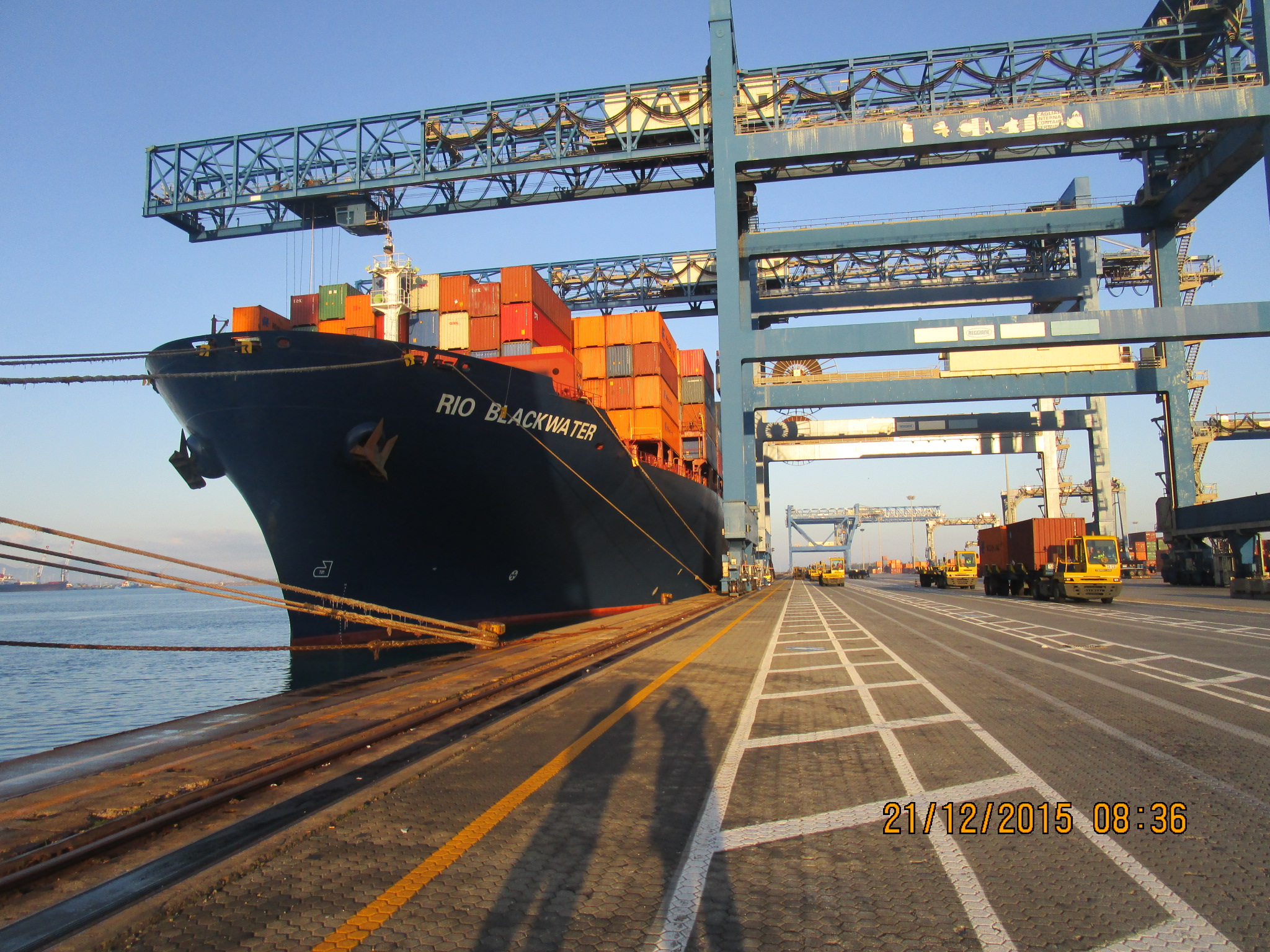 With a LOA of 335 meters and a maximum capacity of 8,750 TEUs, the m/v Chicago Express – operated by German carrier Hapag Lloyd – was the first to arrive on the East Bound leg of the string. Less than 24 hours later from the departure of the former, m/v Rio Blackwater was berthed, sailing in the West Bound leg. The 275 meters long m/v Rio Blackwater is run by Orient Overseas Container Line.