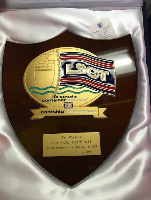 For this special occasion, a delegation from ONE Italy made the trip to LSCT, including Operations Manager, Marco Torretta and Andrea Zuffanti, Senior Ports Coordinator who gratefully participated in the crest delivery ceremony, a longstanding tradition in LSCT for maiden-calls. The guests were accompanied on board by Alfredo Scalisi, the new General Manager of the terminal, Alessandro Pellegri as Operational Manager, Peter Robino Sales & Business Development dept. of Contship Italia and LSCT Terminal foreman Enrico Baldassarri. The local agency partners of ONE were also present and everyone was welcomed on board, by Captain Kumar Alok and his crew to commemorate the call in La Spezia.