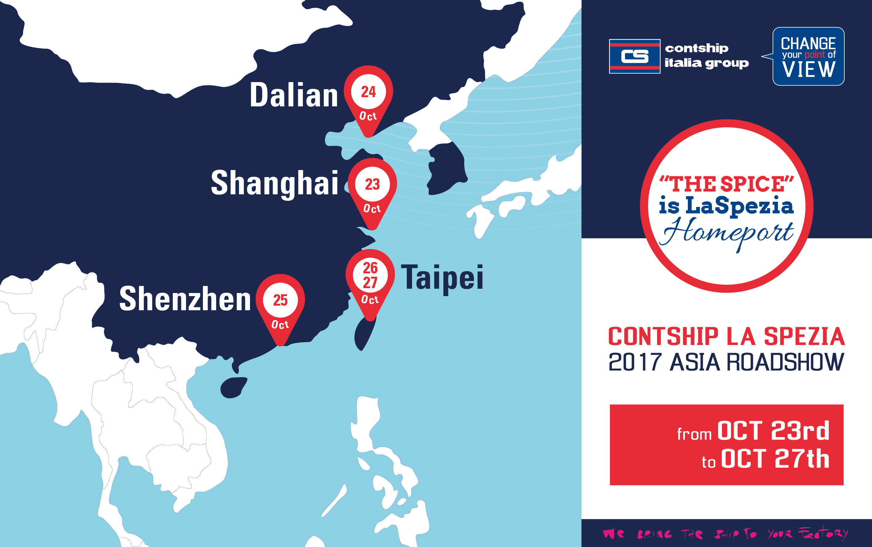 The Contship team will tour Shanghai, Dalian, Shenzhen and then Taipei from October 23 to 27. Meetings and presentations with clients and partners will take place by invitation.
