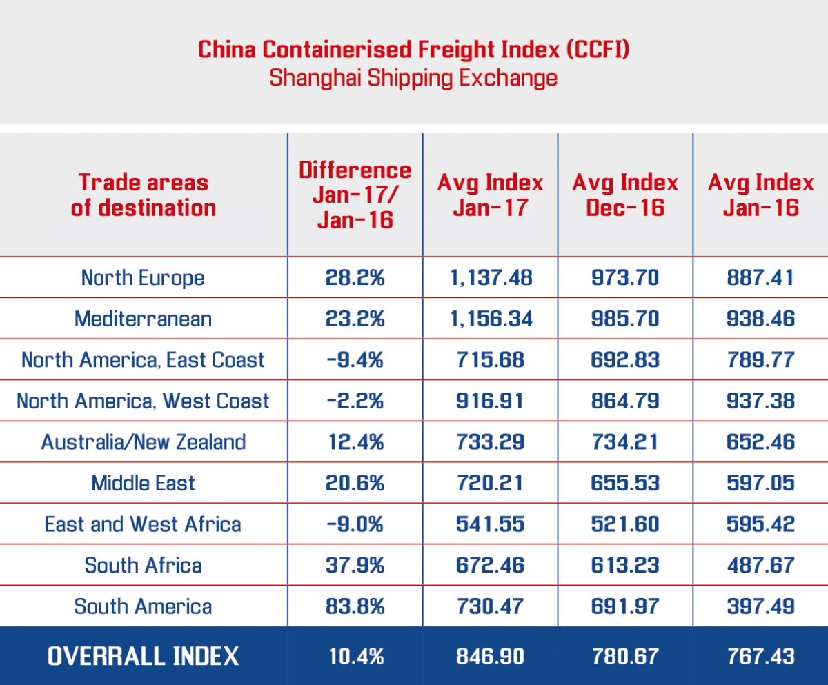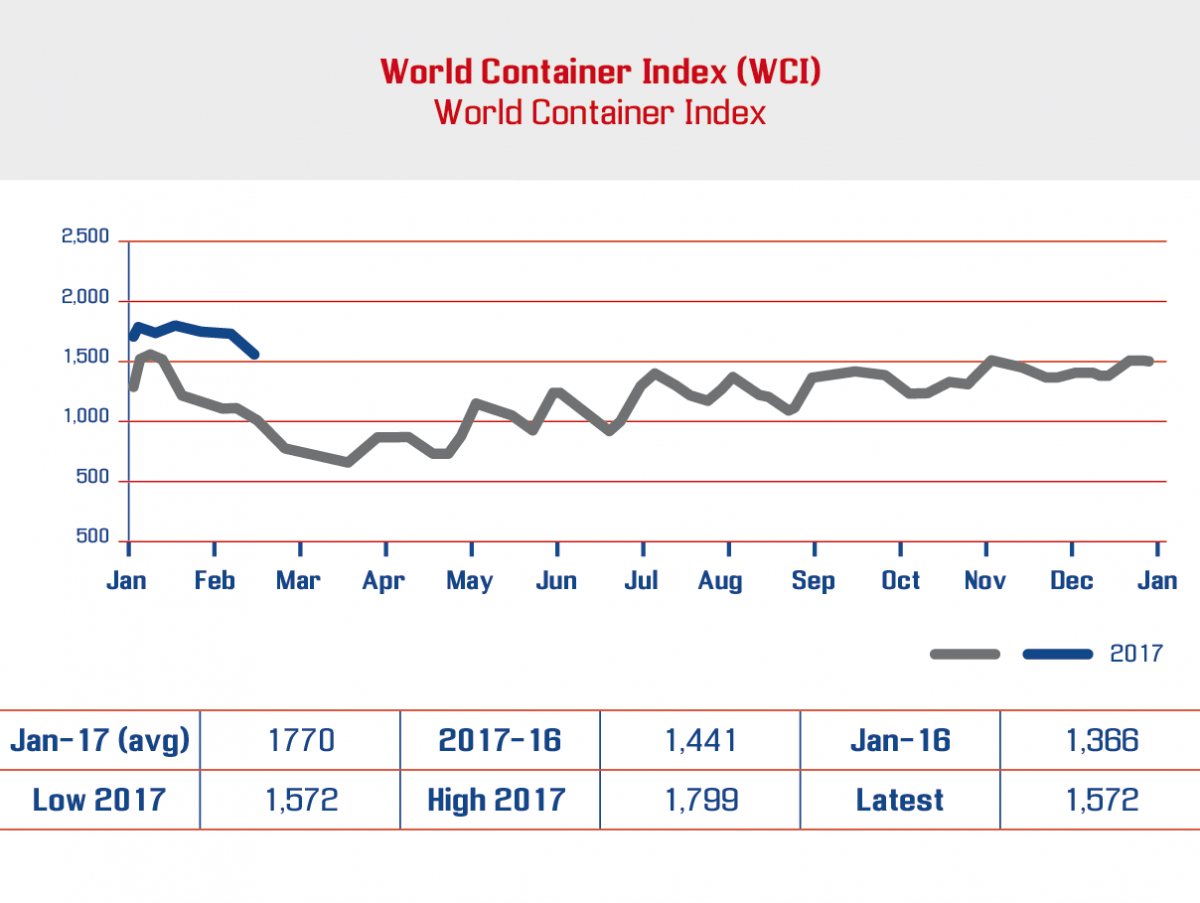 Looking at the Shanghai Containerised Freight Index (SCFI), the average freight rates on major East-West trades improved substantially during the course of the year, especially in the fourth quarter of 2016. The World Container Index (WCI) assessed by Drewry illustrates a similar development. An unusually early Chinese New Year helped carriers sustain those increased rate levels.
