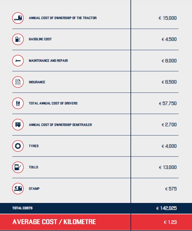 This graphic shows a summary of the main operating costs of a road train. The average operating cost per kilometre is obtained comparing the total costs (excluding structural costs) to the average distance, estimated at 115,000 km/year. (source: Hannibal S.p.A.)