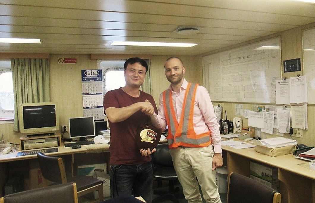 Captain Liu Yue was presented with the customized crest by planner Andrea Gatti, pictured together on deck. MSC Romanos sailed from Fornelli West the same day of arrival, having completed operations at dusk.