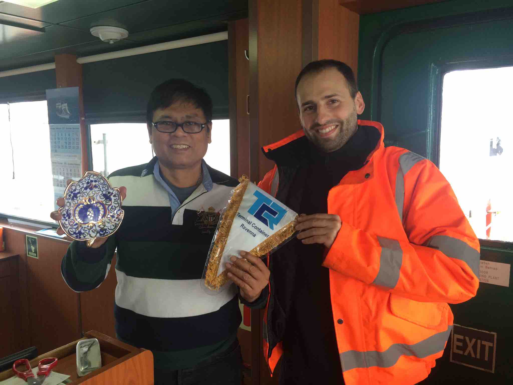 During the execution of operations onboard the ship, following a consolidated tradition, Roberto Geminiani, TCR Planner, delivered a personalized crest to the ship Captain, Jorge Maraon, to celebrate the m/v K-RIVER’s maiden call in Ravenna.