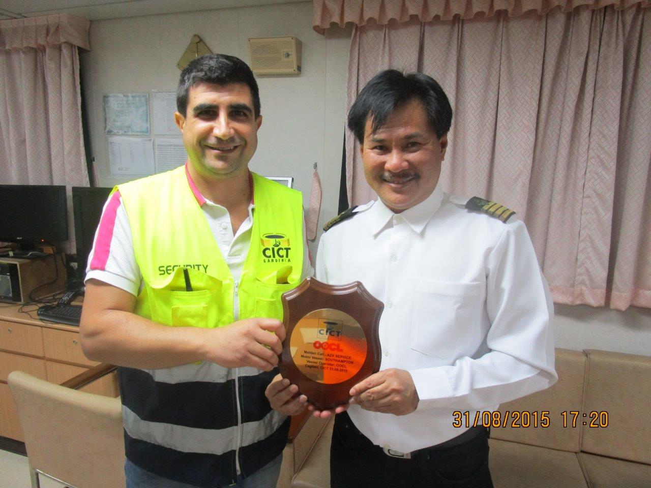 While the ship was under operations, following a CICT tradition, Maurizio Defrassu (CICT Ship Planner) presented Captain Cheong Poh Meng with a crest celebrating the ship maiden call in the Contship Sardinian Hub.