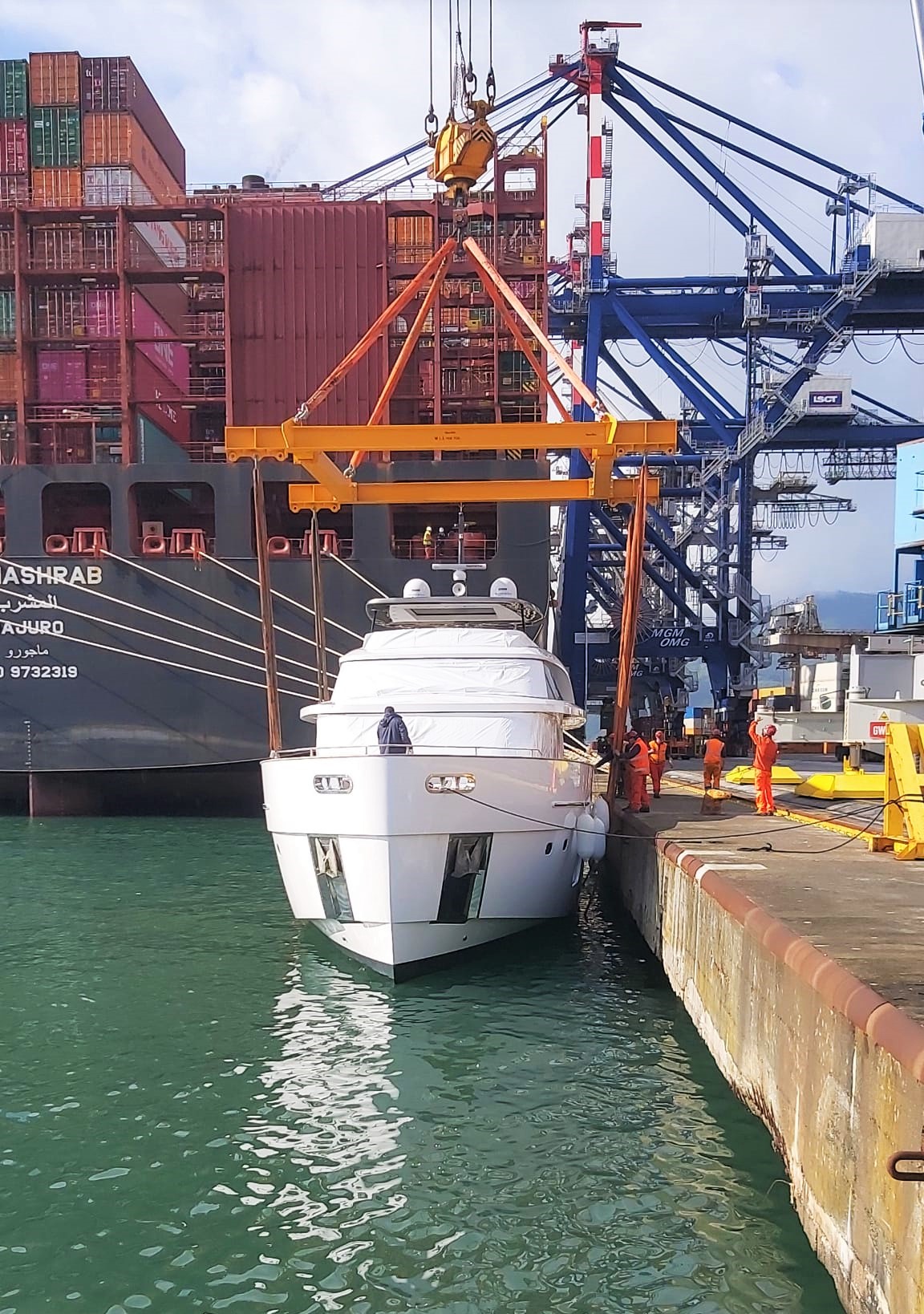 The yacht weighing 75tons and 25m in length, was successfully handled from the water and secured on the deck of the 15,000 TEU containership Al Mashrab, destined for Hong Kong. The ship, operated by Hapag-Lloyd, is one of eleven deployed on THE Alliance MD2 service connecting Asia with the Mediterranean.