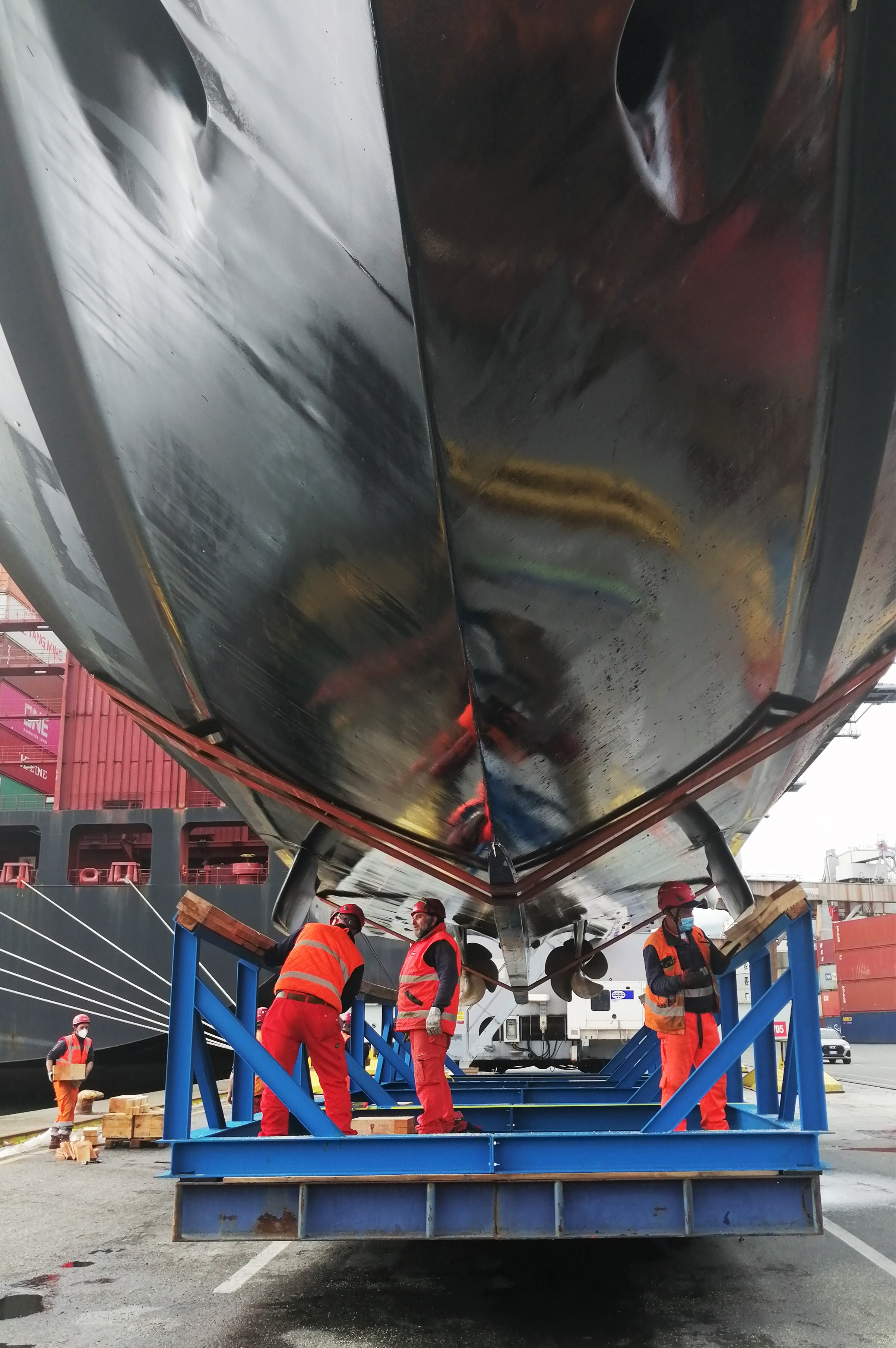 The mega yacht was berthed astern of the 368m containership and was lifted from the water by a mobile crane using special straps and placed onto a custom-built cradle to safely secure the hull and keel. Once loaded and secured on to the deck, the operation was completed with specialized technicians fitting a thermoplastic protective film covering the entire yacht.