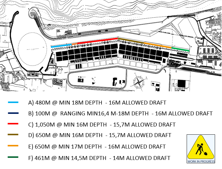 The dredging programme at the berth now provides from a total of 3,391 m overall, except 461 m length that is assigned at 14.00 m, all other berths are assigned at 15.70 – 16.00 m actual draft, with variable under-keel clearances up to a maximum of 2.00 m. (see adjacent schematic).