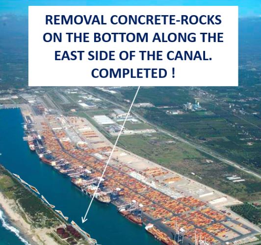 Ships entering and departing the terminal will now benefit from a minimum water depth of 18.00 m in an extended area (see attached image).  The programme of work was performed contemporarily with a second Port Authority programme to further improve operational drafts at the berth. MCT has, since a number of years, operated ships with a draft in the range of 15.50 m. The deepest draft operated to date is 15.80 m, on a ship that called on November 15, 2012.