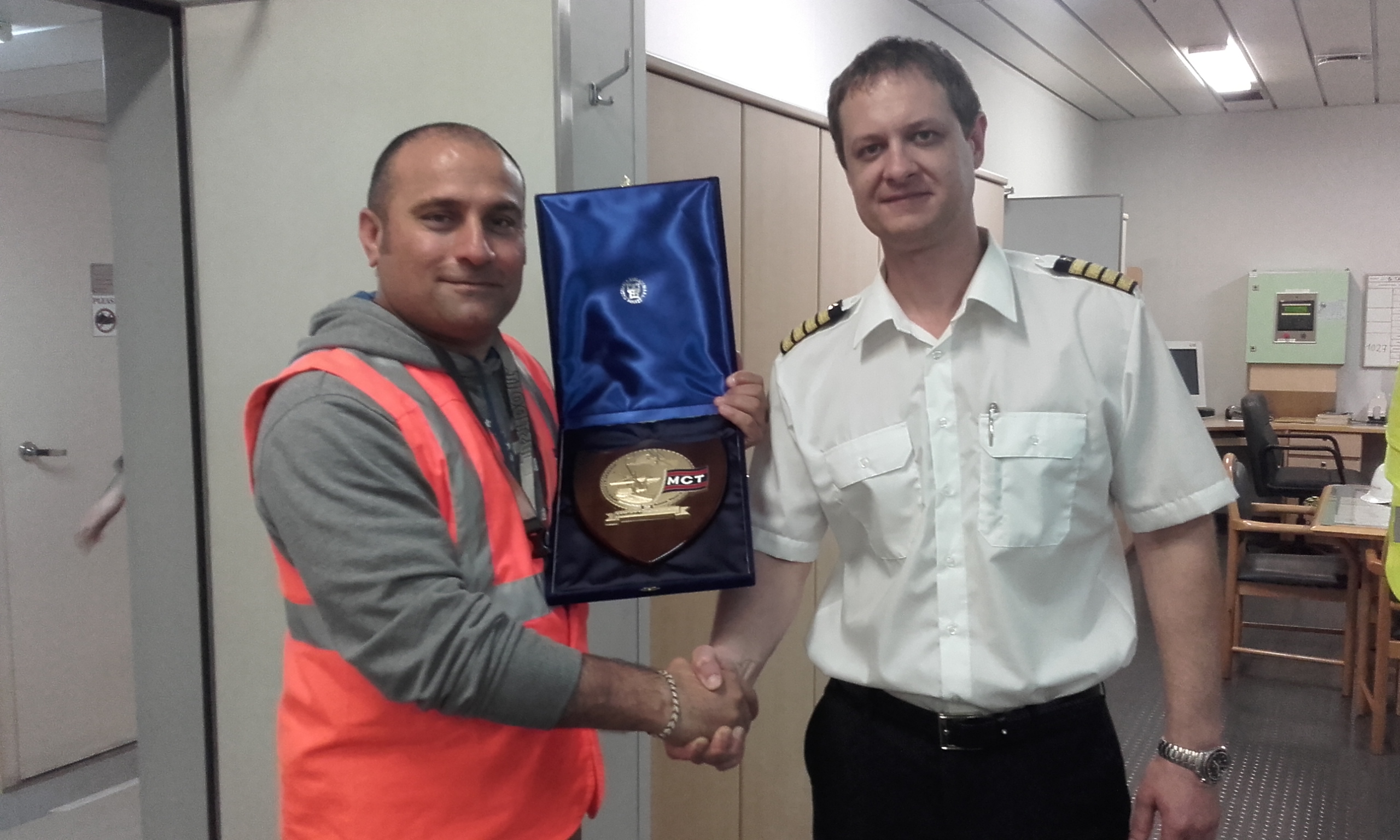 Before departing on Saturday 30th, Ukrainian captain Tretyakov Oleksandr was presented with the customized crest by planner Vincenzo Musumeci, a gift for ER Long Beach’s maiden call at Gioia Tauro.
