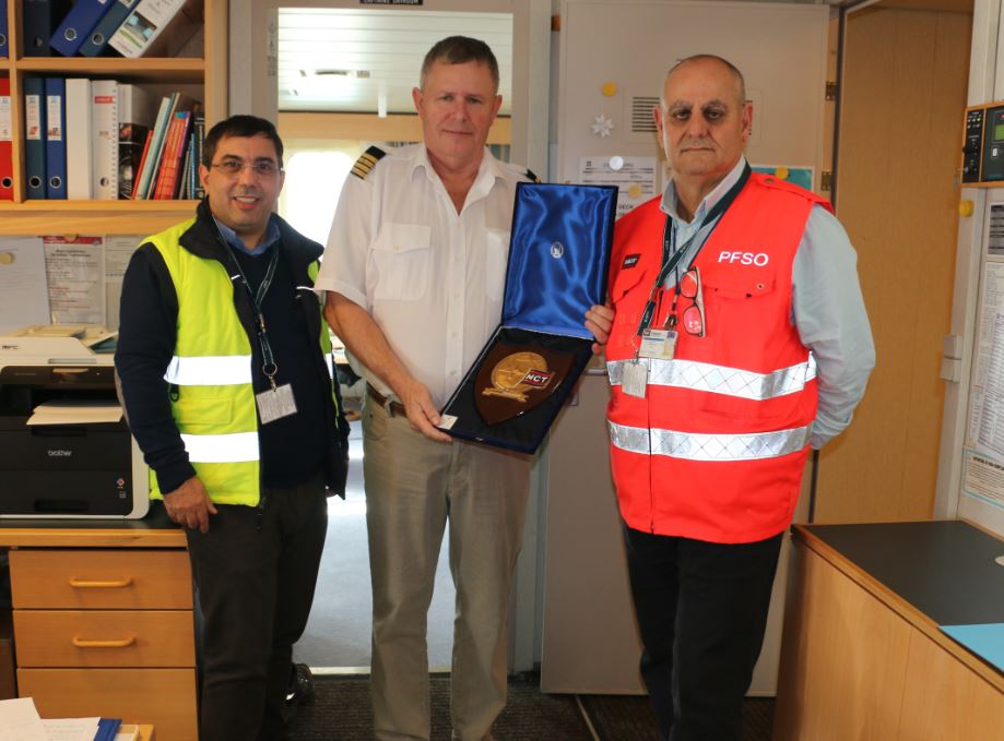 Berthing at at 13:30 hrs, the MCT team quickly commenced operations in order to complete as per the schedule requirements, but still found the time to commemorate this event, with the time honoured ceremony of delivering an MCT crest to the ship command, as Pasquale Papalia (MCT - Customer Service manager) and Francesco Taccone (MCT - PFSO) met Captain Poul Vejhe Møller (Ship’s master) whilst loading and discharging operations were being performed.