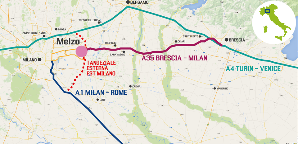 This new link directly connects two major highways: the A4 (Turin-Venice) and the A1 (Milan-Rome) eliminating the need to use the notoriously congested inner road ring (Tangenziale Interna). TEEM overall length is 32 km long, and has three lanes in each direction, winding across the provinces of Milan, Monza Brianza, and Lodi, an economic area responsible for more than 50% GDP of the region itself, Lombardy.