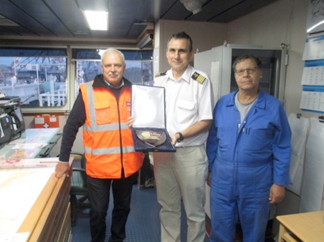 Tradition was also maintained as Al Qibla captain Andrzej Spisak and chief officer Yasser Albassyouney was presented with the customized crest by LSCT planning team member Stefano Colombani to celebrate the ship's maiden call at La Spezia, as a memento of a day.