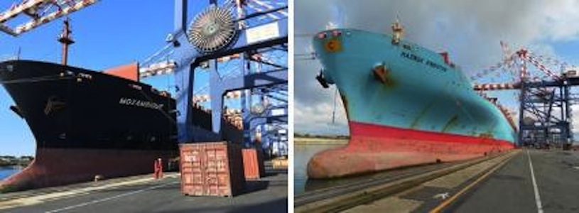 In the photos, m/v Maersk Kingston, LOA 304 metres and 6,252 TEUs in nominal capacity and m/v Mozambique, LOA 299 and 6202 TEUs in nominal capacity – likewise phased in and berthed a week earlier – with their ship captains Flampouris Dimitrios and Sergiy Kravchenko respectively, being presented the customized crest by members of MCT and LSCT planning teams.