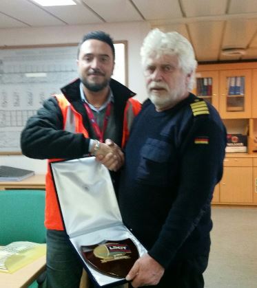 In photo Captain Dietmar Schottowski is presented with the customized crest by LSCT planner Simone Canata, a memento of Northern Monument maiden call at a “windy” La Spezia.
