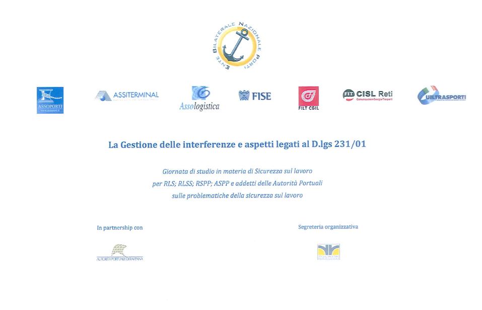 L’incontro, organizzato venerdì 5 febbraio 2016 presso la sala conferenze della Autorità Portuale di Ravenna, aveva come titolo: ”La gestione delle interferenze e aspetti legati al D.lgs.231/01”. La giornata, promossa dall’Ente Bilaterale Nazionale Porti in partnership con l’Autorità Portuale di Ravenna e la Scuola Nazionale Trasporti e Logistica, ha visto la partecipazione di rappresentanti di ASSITERMINAL, ASSOPORTI, ASSOLOGISTICA, FISE, FILT CGIL, FIT CISL e UILTRASPORTI.