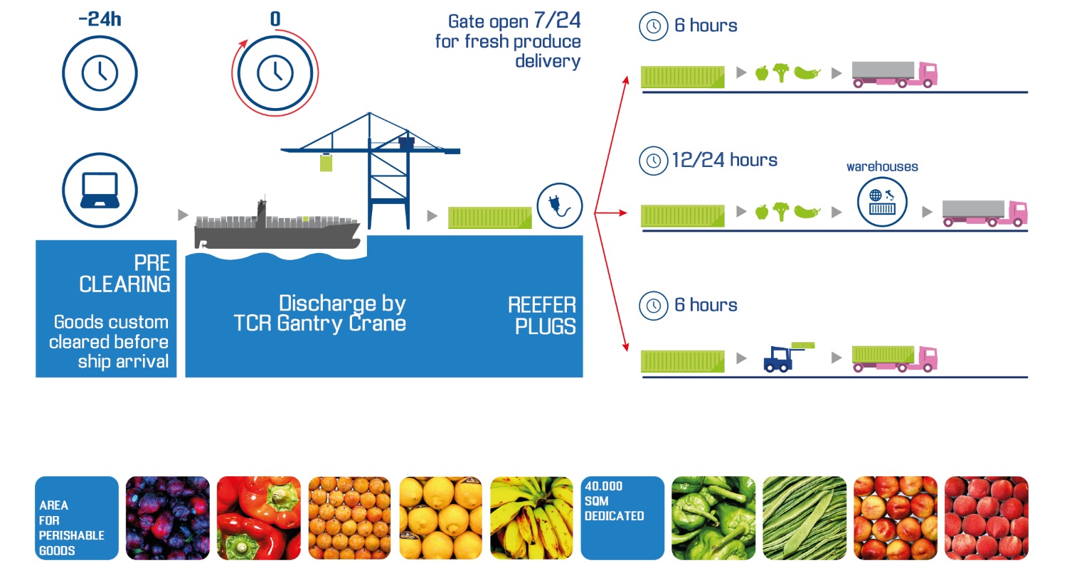 La maggior parte della merce ha destinazioni internazionali, raggiunge infatti i mercati del nord Europa (Germania, Olanda, Belgio, Gran Bretagna) con l’impiego di camion refrigerati, dopo lo svuotamento che avviene all’interno delle aree del terminal TCR e degli attigui magazzini refrigerati gestiti dalla DCS TraMaCo, operatore di logistica specializzato che cura circa l’80% di questi traffici.