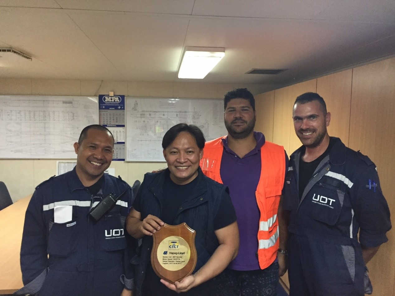 Christian Marras, planner CICT, ha dato il benvenuto al Capitano Reynaldo Sabale, al Primo Ufficiale Athasions Katsaounis e al Secondo Ufficiale Donald Gillo-Ano, consegnando loro il crest commemorativo, una tradizione consolidata, dedicata agli scali inaugurali presso i terminal del Gruppo Broström.